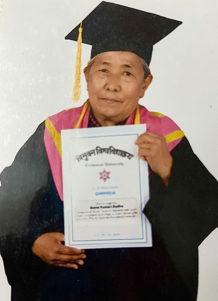 In 2023, at the age of 72, she completed her Master’s degree in Sociology from Tribhuvan University—a moment that captured national admiration. Many mistook her for a guest at the convocation ceremony, only to be moved when she proudly donned her own cap and gown.